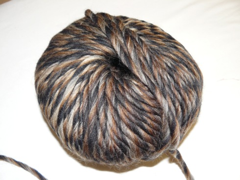 Choisissez une pelote de très grosse laine, de préférence de la laine mèche. J’ai utilisé la Rowan Drift chinée, vous pouvez aussi choisir la Big Wool, même caractéristiques mais unie. Les 2 se tricotent avec des aiguilles 10 ou 15!