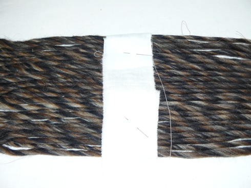 Piquer à la machine tous les 15 ou 20cm (à coté des tissus blanc) pour fixer les fils entre eux. Bien faire pression avec les mains pour que les fils ne s’écartent pas. Faire 7 à 8 passages espacés de 1 cm environ.