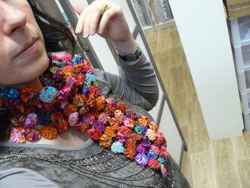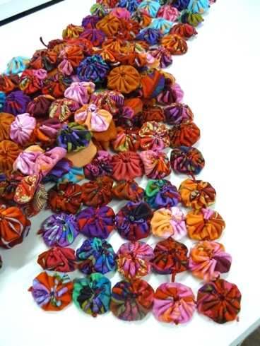 Faites des yoyos de 3cm de diamètre comme dans la vidéos ci dessous (ici, dans des tissus Kaffe Fassett), puis assemblez les avec un fil bien solide, ou du ruban à broder comme ici.