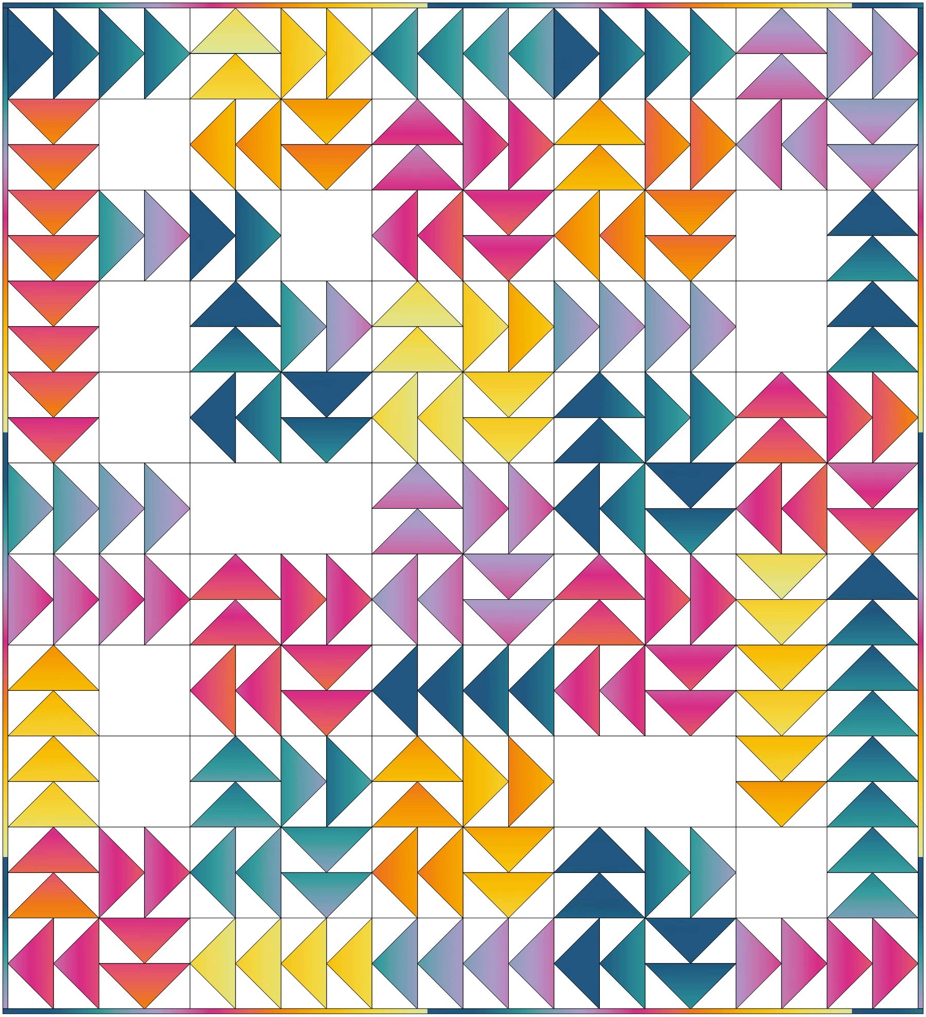 Astuce : réalisez plusieurs blocs d’affilée avec la même bande de tissu — vous verrez votre dégradé se transformer progressivement, comme une chorégraphie colorée, comme ici sur notre modèle Alizés. Initialement prévu avec 13 tissus dégradés différents, je l’ai juste redessiné avec un seul tissu dégradé multicolore.