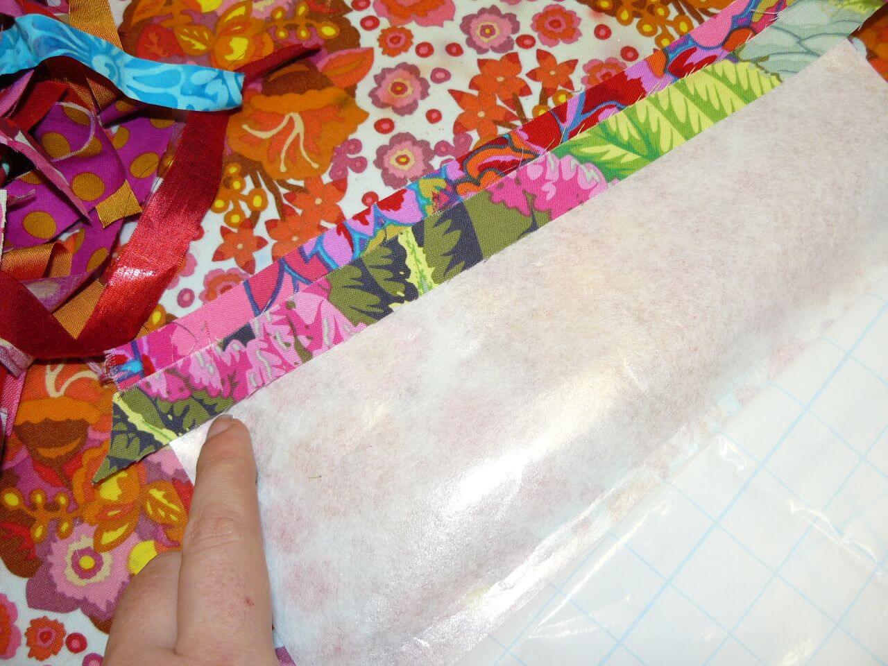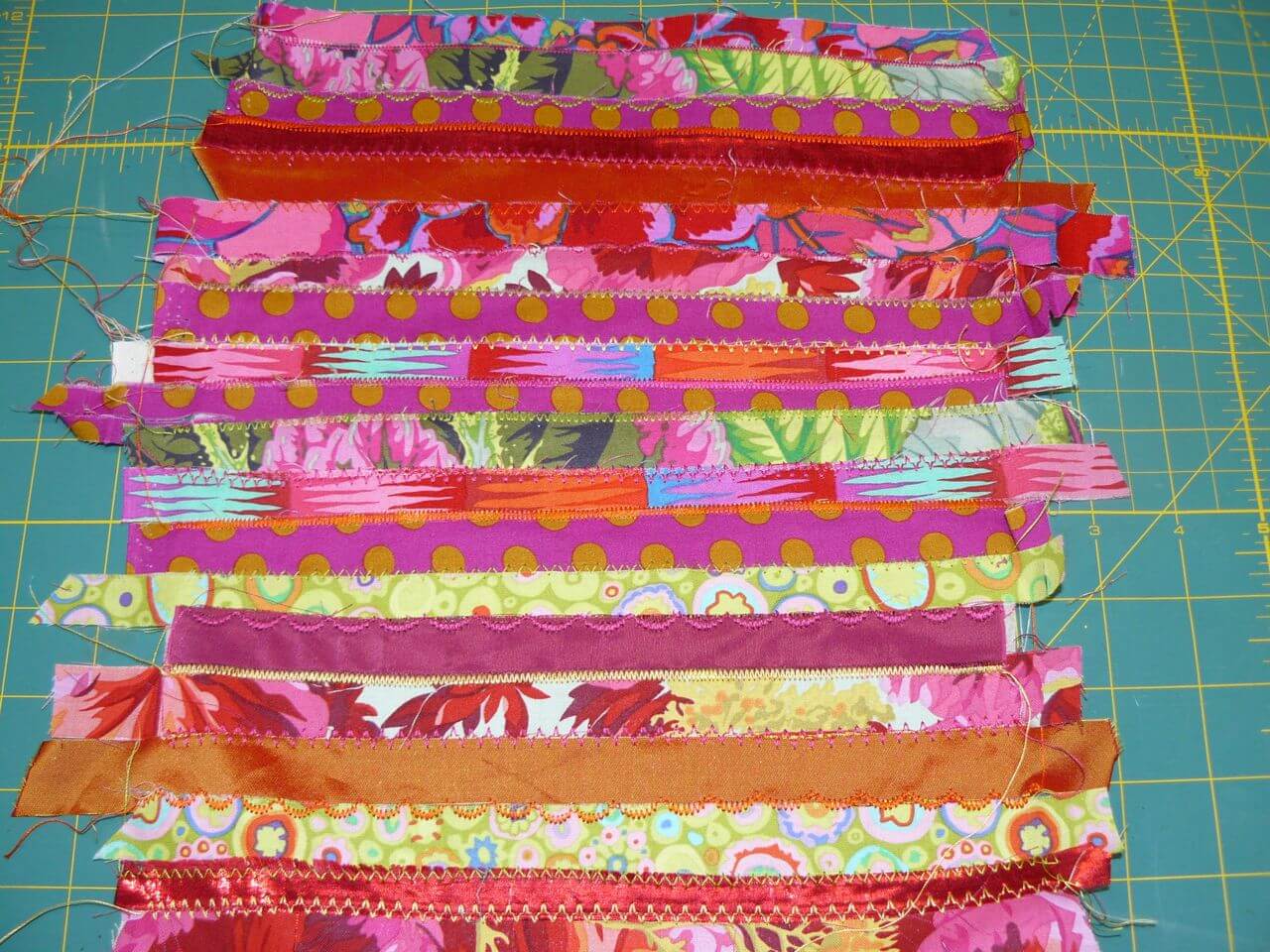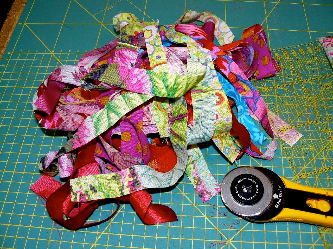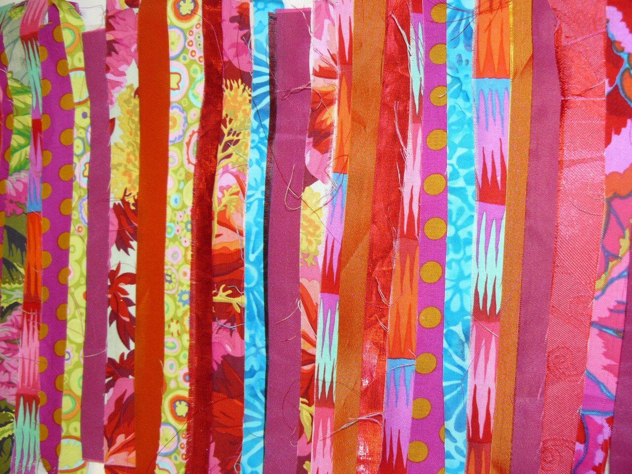 Au cutter, découpez vos chutes de tissus en bandes de 2 à 3 cm.