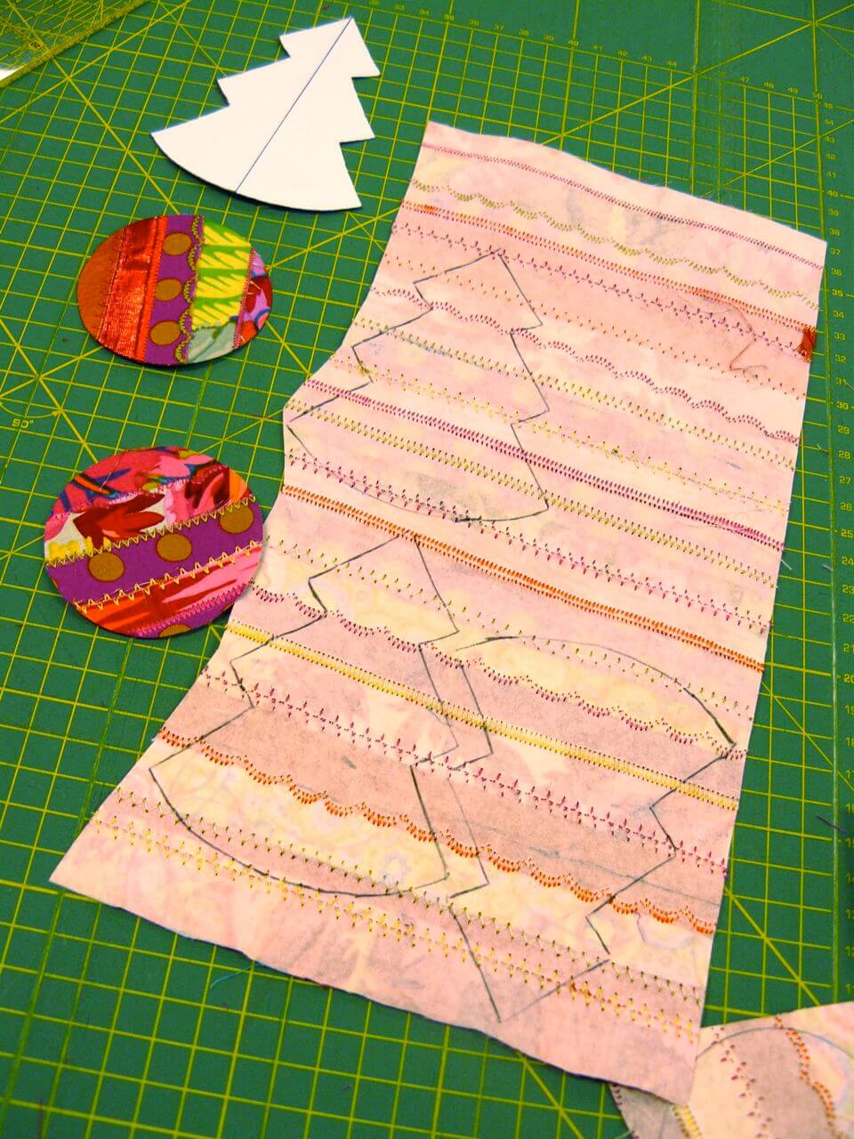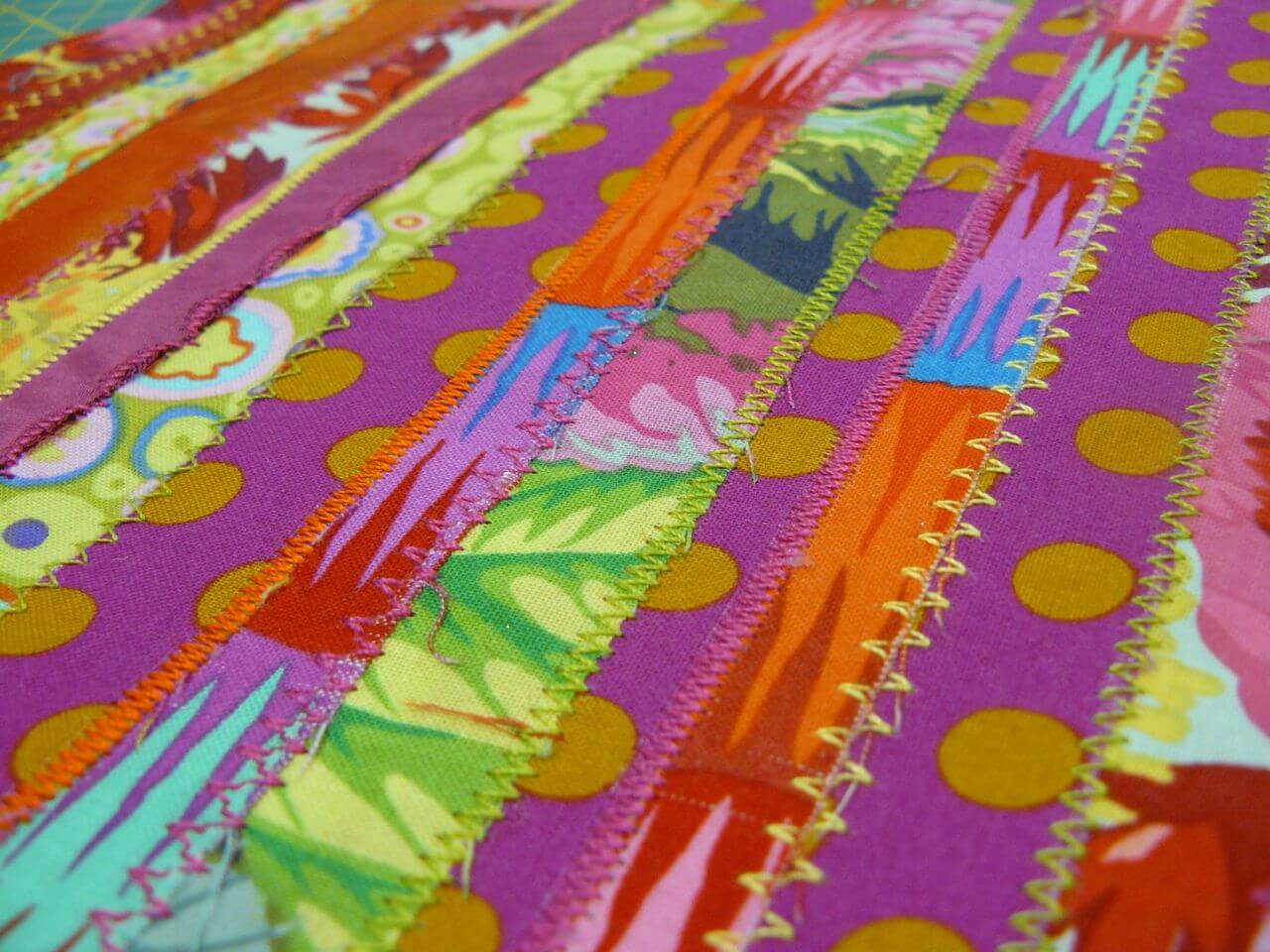 Ensuite, sortez la machine à coudre, et en utilisant les points fantaisie de votre machine, piquez à la jonction des bandes. Variez les couleurs et les points. J’utilise, comme toujours, mes fils préférés, les fils Aurifil Mako 40.